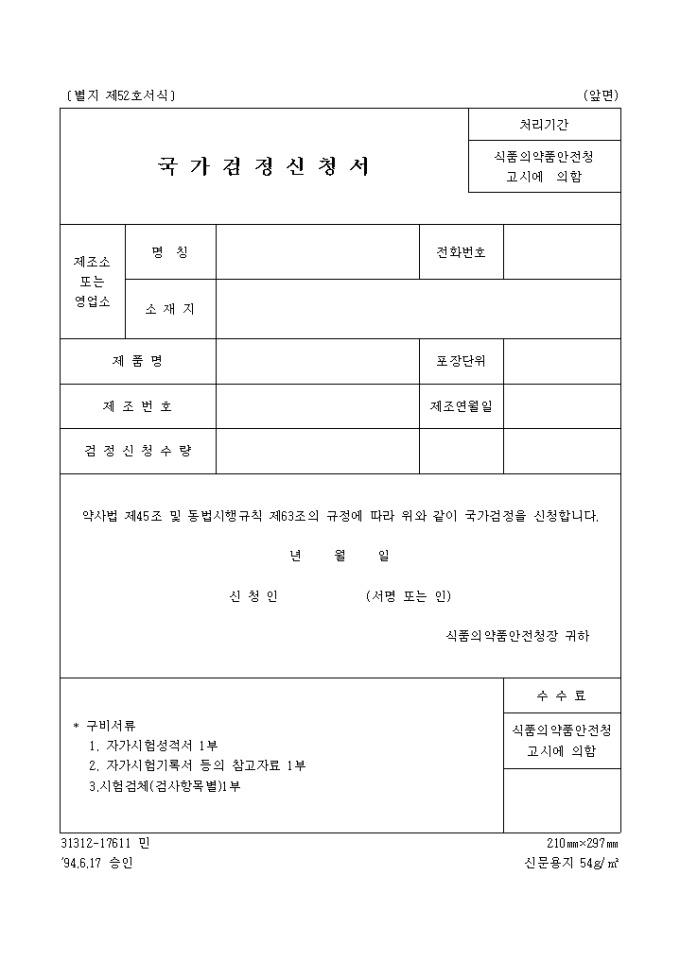 국가검정신청서(94.6.17(별지 제52호서식)