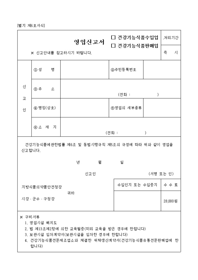 9,000원/월건강기능식품에관한법률 제6조 및 동법시행규칙 제5조의 규정에 의거한 건강기능식품 수입(판매)업 영업 신고서식입니다.