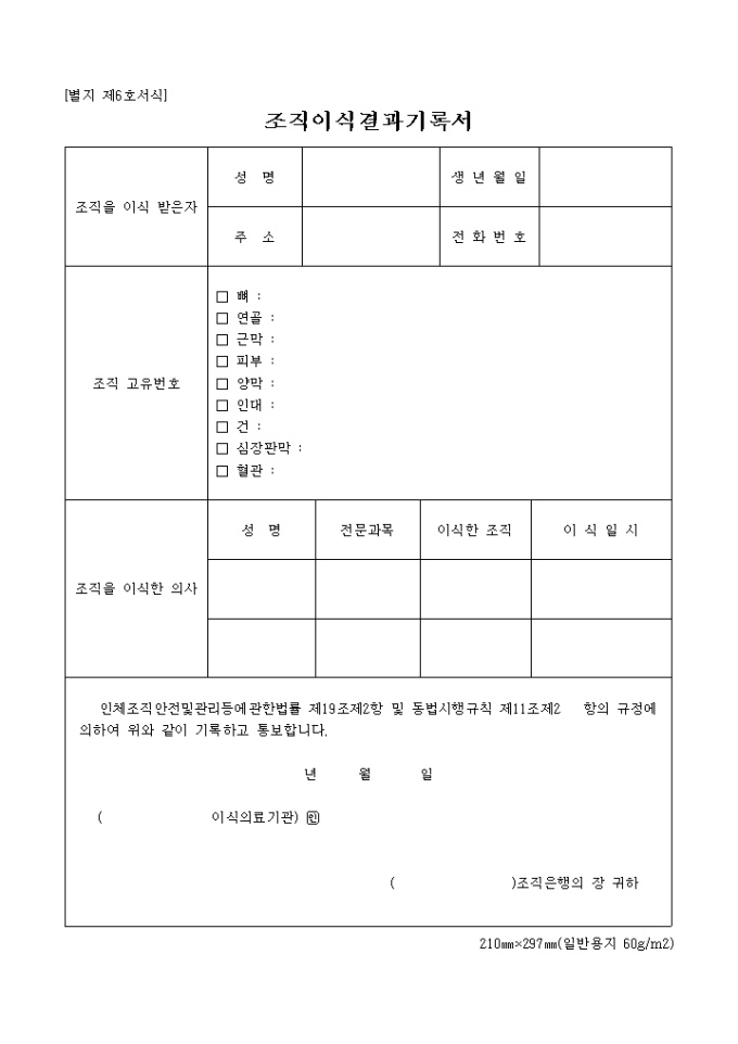 9,000원/월인체조직안전및관리등에관한법률 제19조 제2항 및 동법시행규칙 제11조 제2항의 규정에 의거한 조직이식결과 기록서식 입니다.