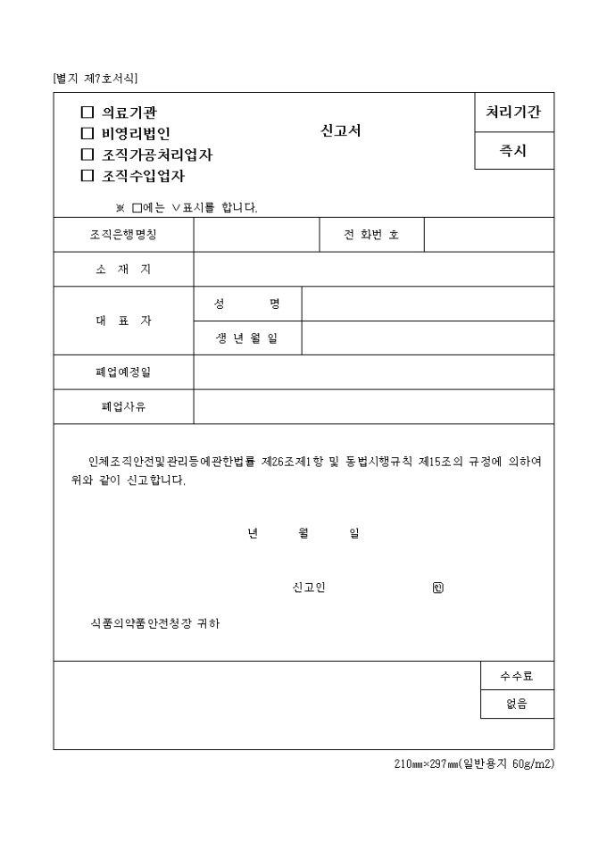 9,000원/월인체조직안전및관리등에관한법률 제26조제1항 및 동법시행규칙 제15조의 규정에 의거한 신고 서식입니다.