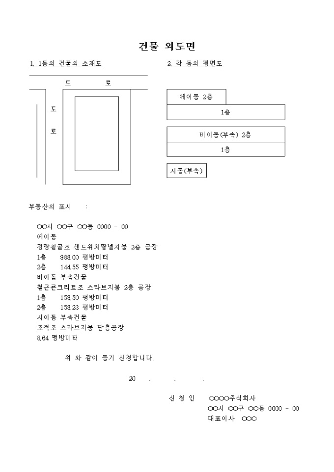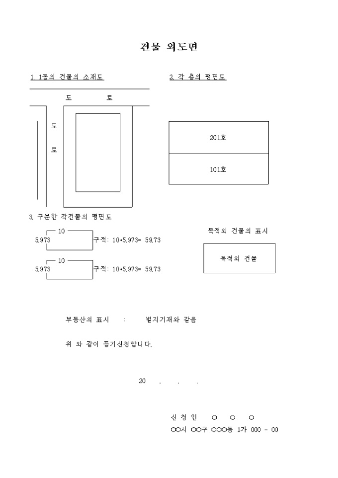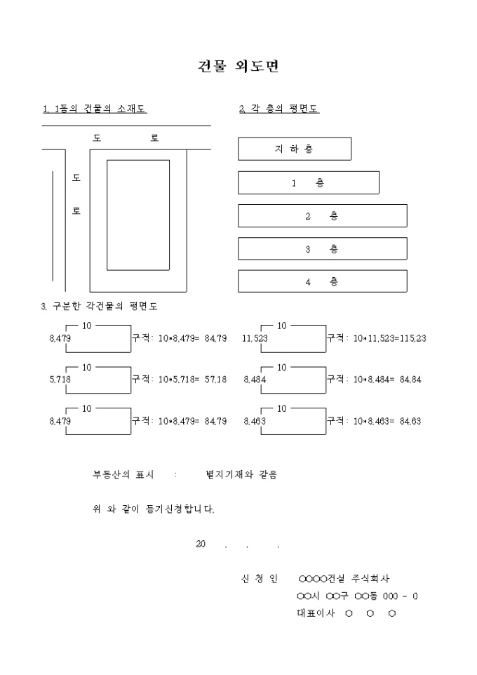 등기신청시 부동산을 특정하기 위한 건물의 외도면 (3단면도)입니다.