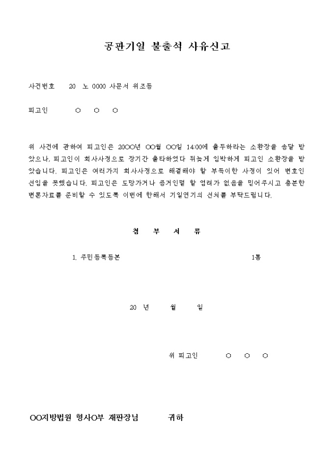 피고인의 개인적인 사종으로 공판기일 불출석한 사유를 신고하는 신고서입니다.