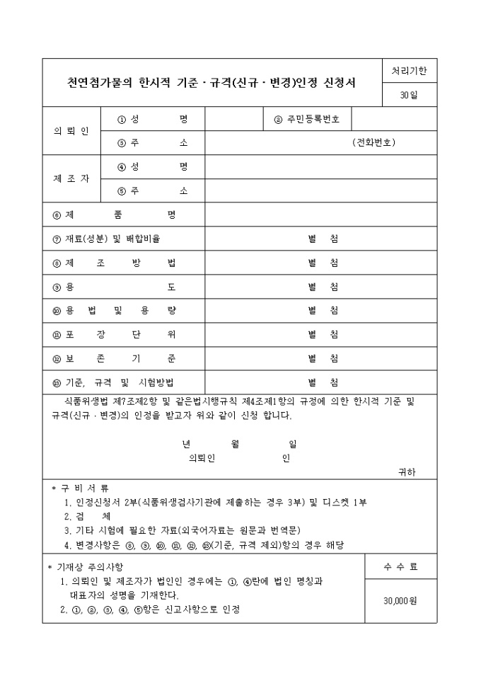 9,000원/월1. 식품위생법 제7조제2항 및 같은법시행규칙 제4조제1항의 규정에 의한 한시적 기준 및 규격(신규·변경)의 인정 신청시 필요한 서식입니다.
