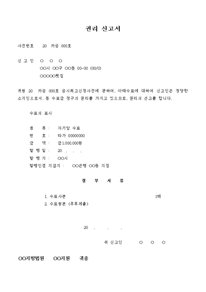 수표의 공시최고 신청사건에 대한 권리신고서입니다.