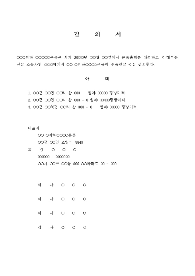 9,000원/월문중총회를 개최함에 있어 부동산을 수증받을 것을 결의하는 문중 결의서입니다.