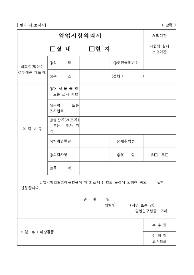 임업시험의뢰서(실내, 현지(별지 제1호서식)