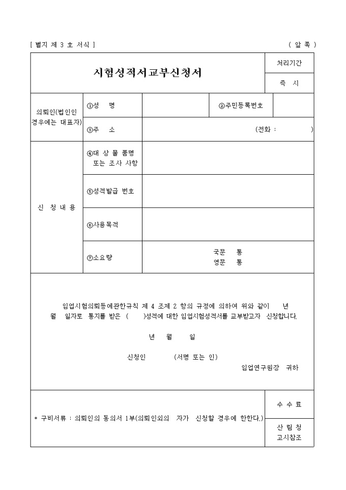 9,000원/월1. 임업시험의뢰등에관한규칙 제4조 제2항의 규정에 의거한 임업 시험성적서 교부받고자 신청시 필요한 서식입니다.