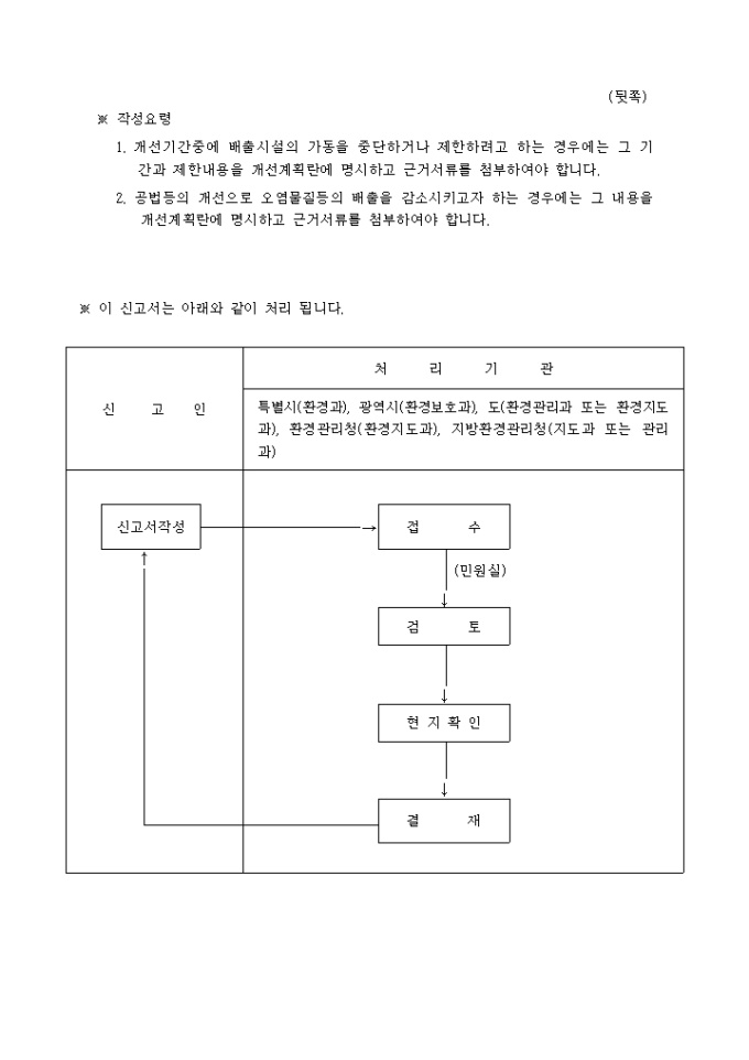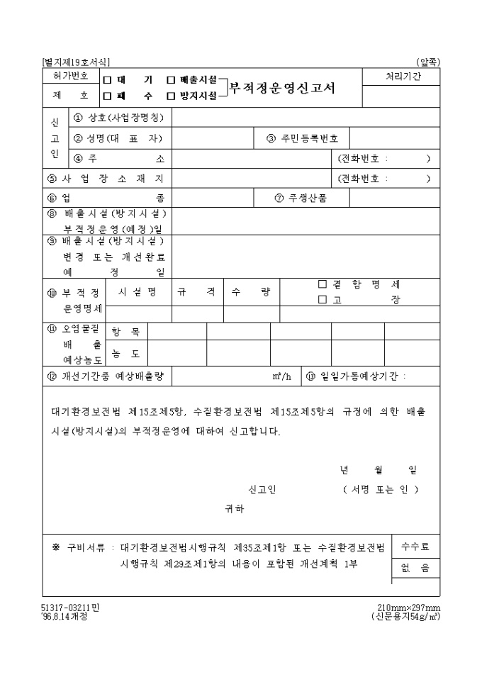 9,000원/월대기환경보전법 제15조제5항, 수질환경보전법 제15조제5항의 규정에 의한 배출시설(방지시설)의 부적정운영에 대하여 신고할 때 사용하는 "(대기,폐수,배출시설,방지시설) 부적정 운영신고서" 양식입니다.