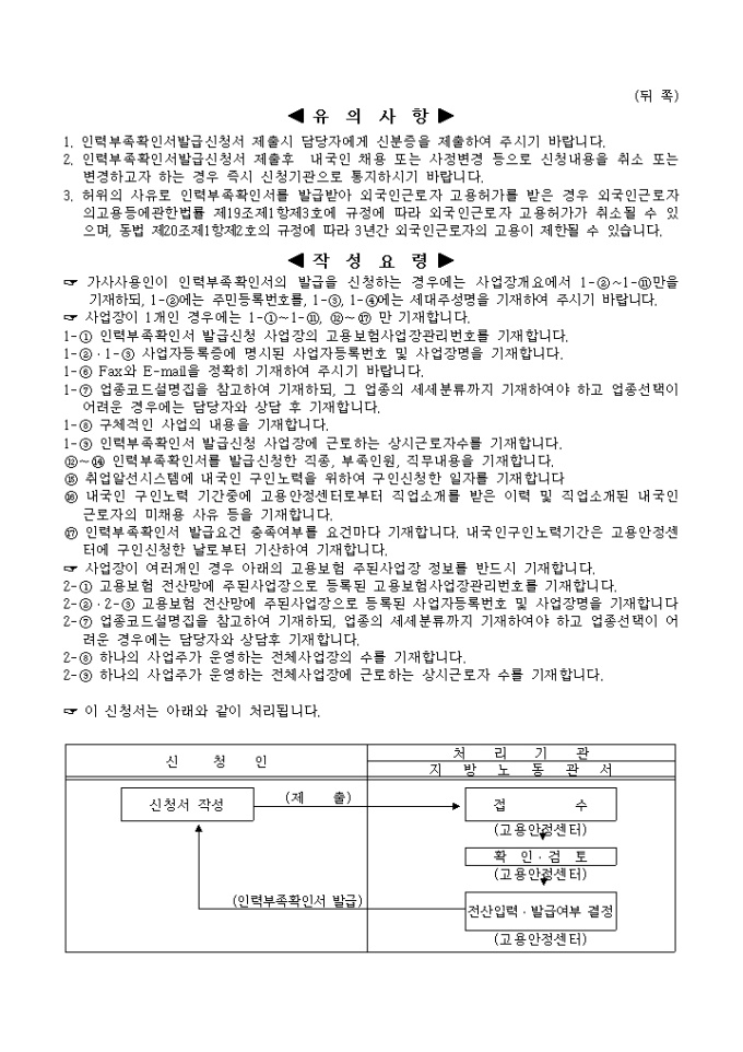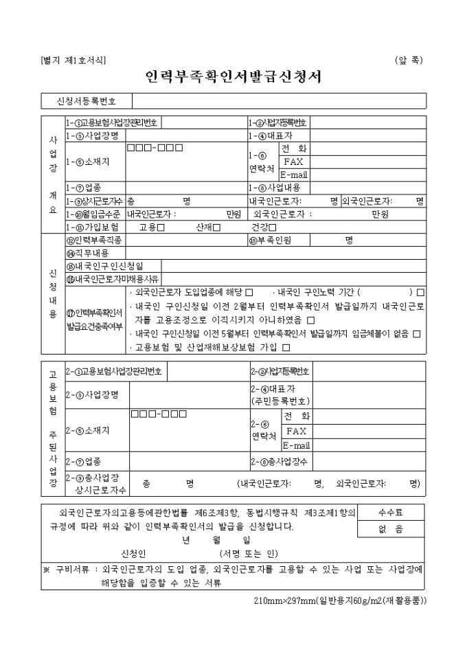 1. 외국인근로자의고용등에관한법률 제6조 제3항, 동법시행규칙 제3조 제1항의 규정에 따른 인력부족확인서 발급 신청서식입니다. 2. 사업장개요(고용보험사업장관리번호, 상시근로자수, 소재지 등), 신청내용(인력부족직종, 내국인구인신청일 등), 고용보험 주된 사업장(총사업장, 상시근로자수, 고용보험사업장관리번호 등) 등의 기재란