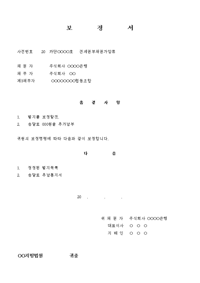 9,000원/월전세권부 채권가압류 신청시 송달료와 별지 부동산의 목록을 보정한 보정서입니다.