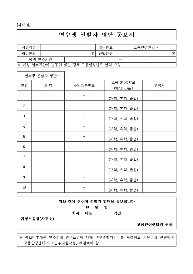 1. 연수생 선발자 명단 통보에 필요한 서식입니다.