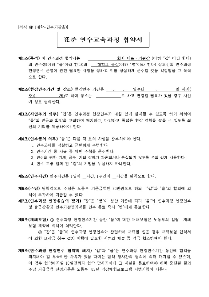 9,000원/월회사 대표, 기관장과 연수생과 대학교 총장, 상호간의 연수과정 현장연수 운영에 관한 필요한 사항을 정하고 이를 성실하게 준수할 것을 약정함을 목적으로 하는 협약 서식입니다.