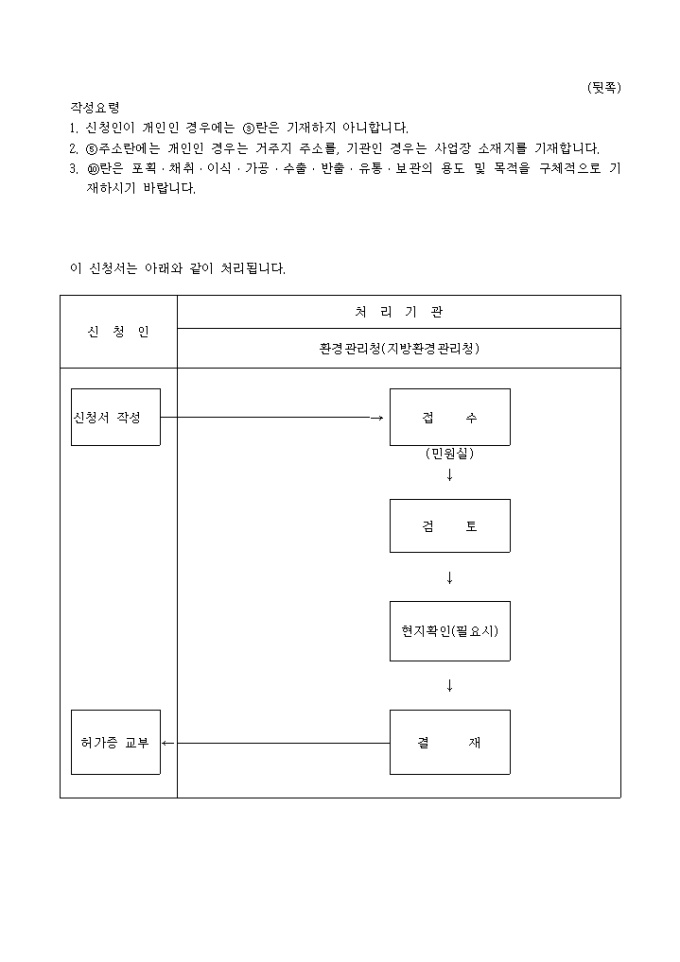 9,000원/월자연환경보전법 제11조제1항 및 동법시행규칙 제4조제1항의 규정에 의하여 (멸종위기, 보호) 야생동·식물의 □포획 □채취 □이식 □가공 □수출 □반출 □유통 □보관의 허가를 신청할 때 사용하는 "(멸종위기,보호)야생 동,식물(포획,채취,이식,가공,수출,반출,유통,보관) 허가신청서" 양식입니다.