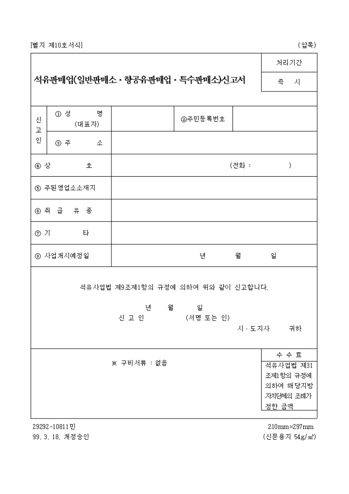 9,000원/월1. 석유사업법 제9조제1항의 규정에 의거한 석유판매업(일반판매소·항공유판매업·특수판매소)신고 서식입니다.