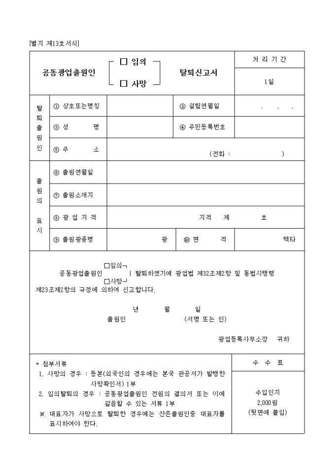 9,000원/월공동광업출원인(임의,사망) 탈퇴하였기에 광업법 제32조제2항 및 동법시행령 제23조제2항의 규정에 의거한 신고서식입니다.
