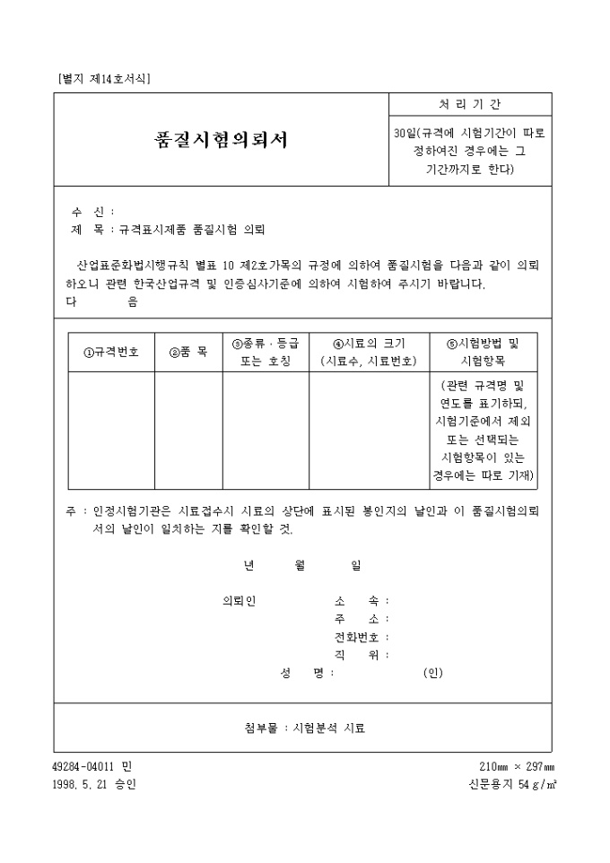 품질시험의뢰서(98.5.21(별지 제14호서식)