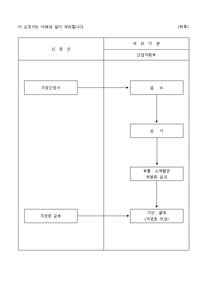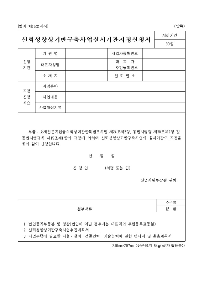 부품·소재전문기업등의 육성에 관한 특별조치법 제24조 제2항, 동법시행령 제30조 제2항 및 동법시행규칙 제15조 제1항의 규정에 의거한 신뢰성향상기반구축사업 실시기관의 지정 신청서식입니다.
