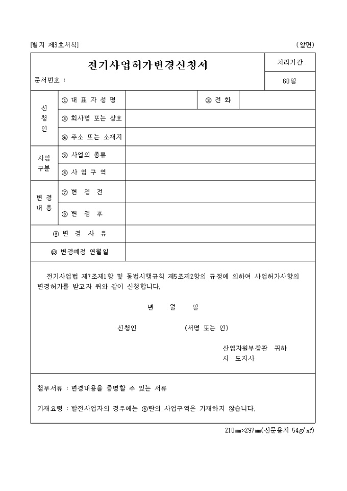 9,000원/월전기사업법 제7조 제1항 및 동법시행규칙 제5조 제2항의 규정에 의거한 전기 사업허가사항 변경허가 신청서식입니다.