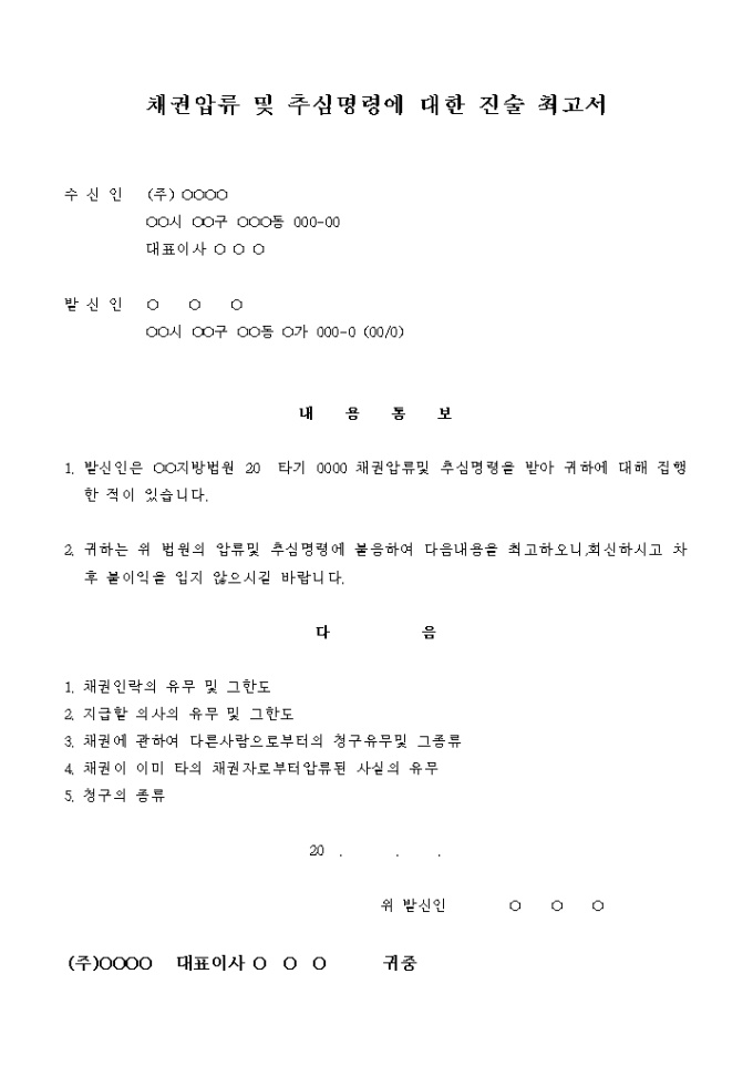 9,000원/월채권압류 및 추심명령에 대한 진술 최고서입니다.