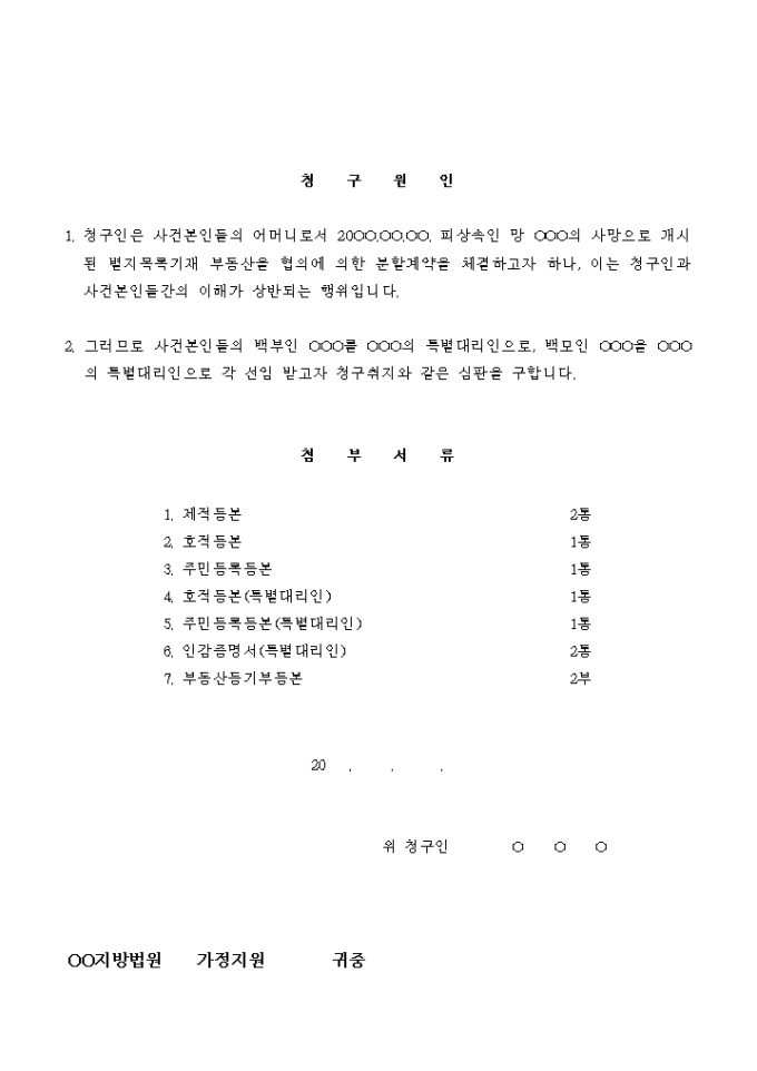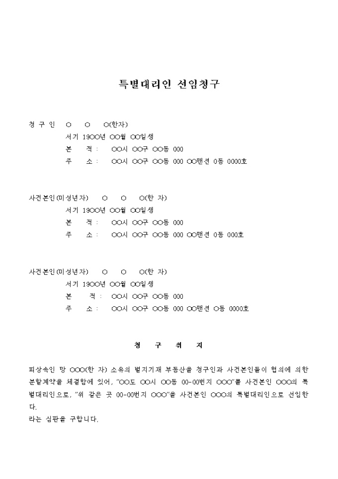 9,000원/월상속인인 미성년자의 상속재산 협의 분할과 관련하여 특별대리인을 선임하는 청구서입니다.
