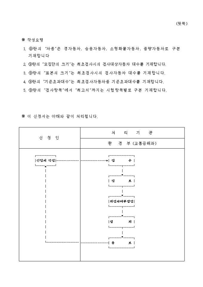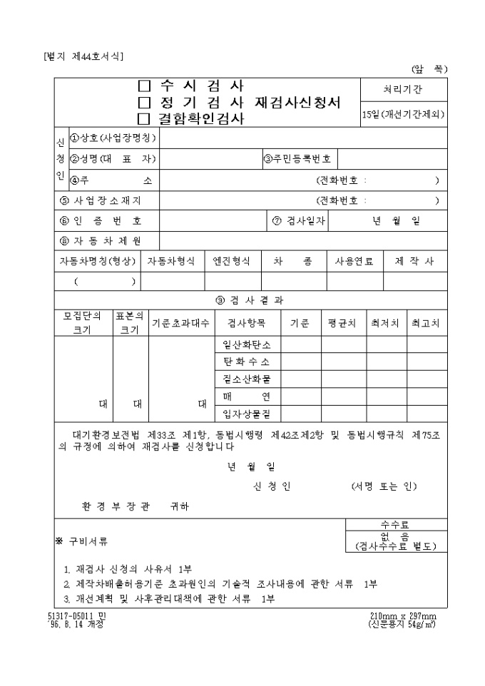 9,000원/월대기환경보전법 제33조 제1항, 동법시행령 제42조제2항 및 동법시행규칙 제75조의 규정에 의하여 재검사를 신청할 때 사용하는 "(수시검사, 정기검사, 결함 확인검사)재검사 신청서" 양식입니다.