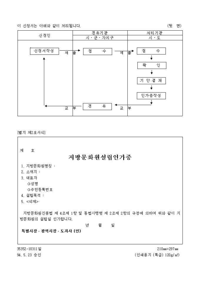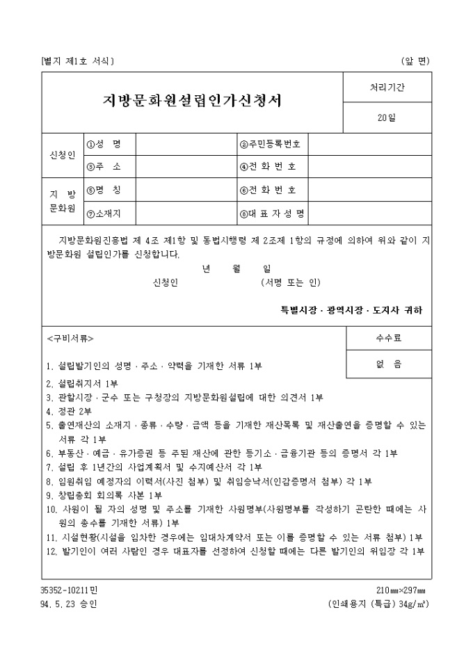 1. 지방문화원진흥법 제 4조 제1항 및 동법시행령 제 2조제 1항의 규정에 의거한 지방문화원 설립인가 신청서식입니다.
