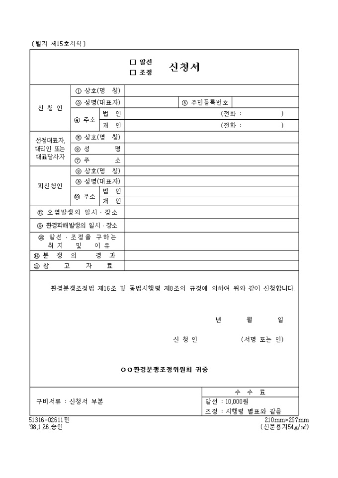 환경분쟁조정법 제16조 및 동법시행령 제8조의 규정에 의하여 위와 같이 신청할 때 사용하는 "(알선,조정)신청서" 양식입니다.