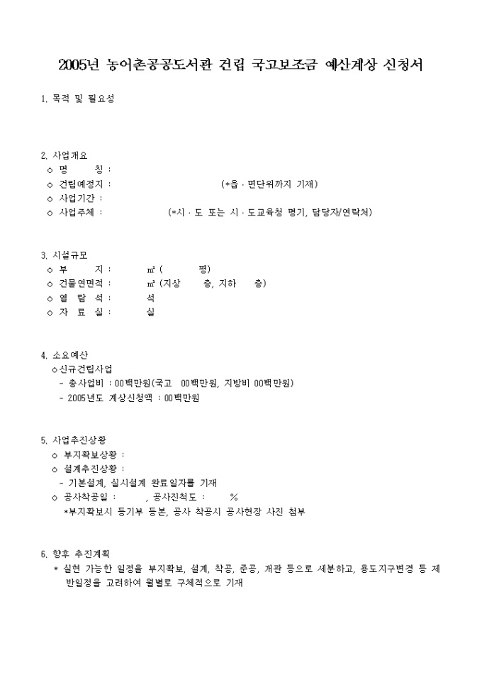 2005년 농어촌공공도서관 건립 국고보조금 예산계상 신청서