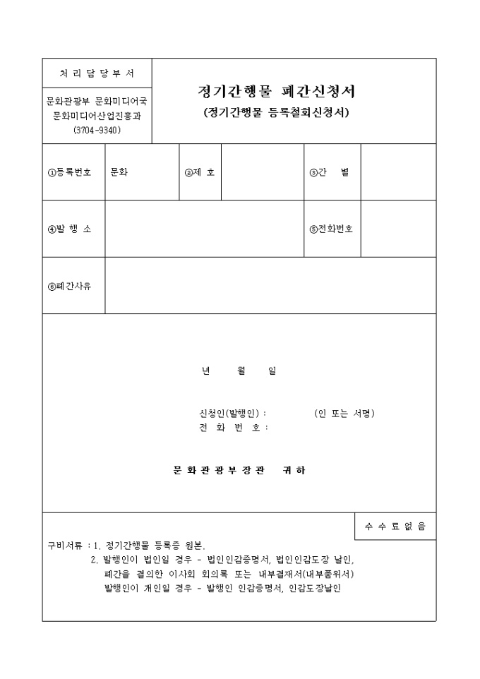 9,000원/월등록번호, 발행소, 폐간사유, 연락처 등의 기재란이 있는 정기간행물 폐간 신청서식입니다.