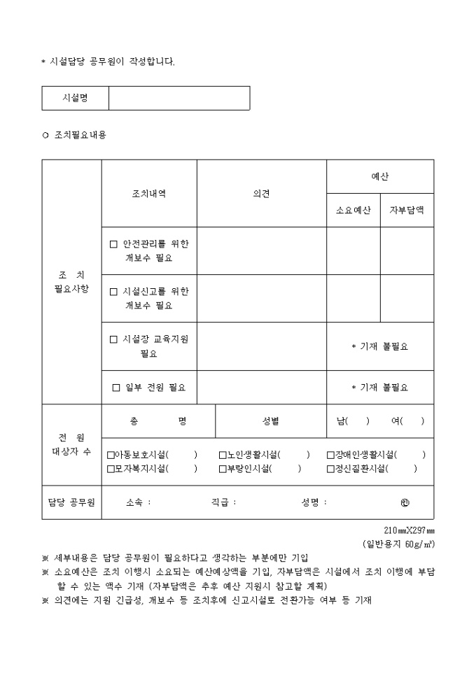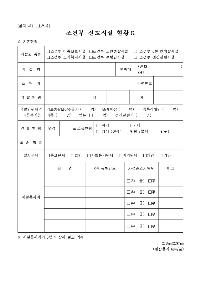 시설의 종류, 생활인원내역, 생활인원내역, 건물현황, 최종학력, 설치주체, 시설종사자 인적사항 등의 기재란이 있습니다.