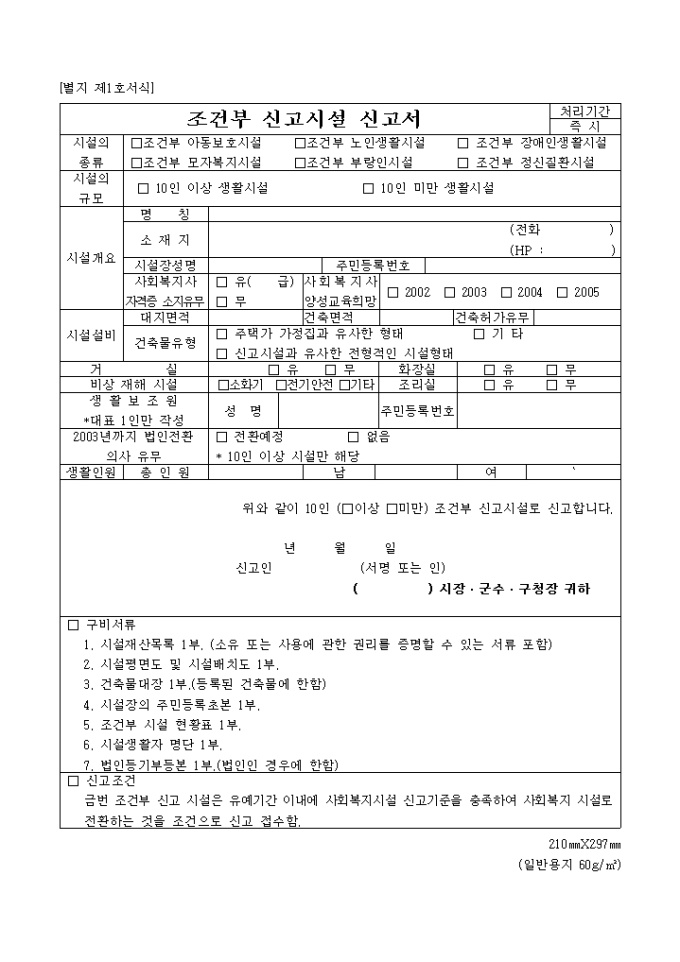 9,000원/월조건부 신고 시설은 유예기간 이내에 사회복지시설 신고기준을 충족하여 사회복지 시설로 전환하는 것을 조건으로 합니다.