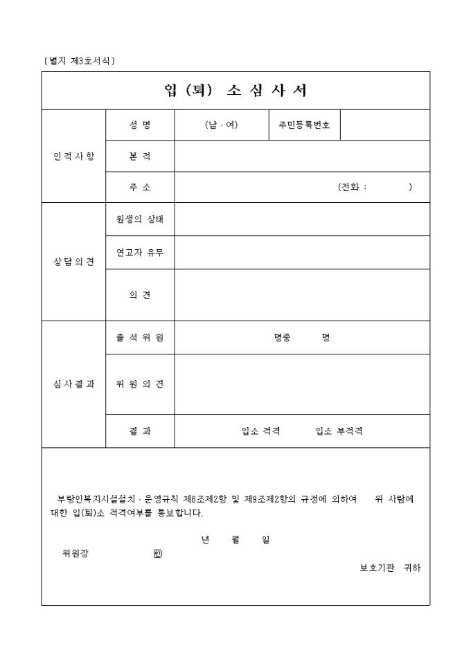 9,000원/월부랑인복지시설설치·운영규칙 제8조 제2항 및 제9조 제2항의 규정에 따른 입(퇴)소 적격여부 심사 서식입니다.