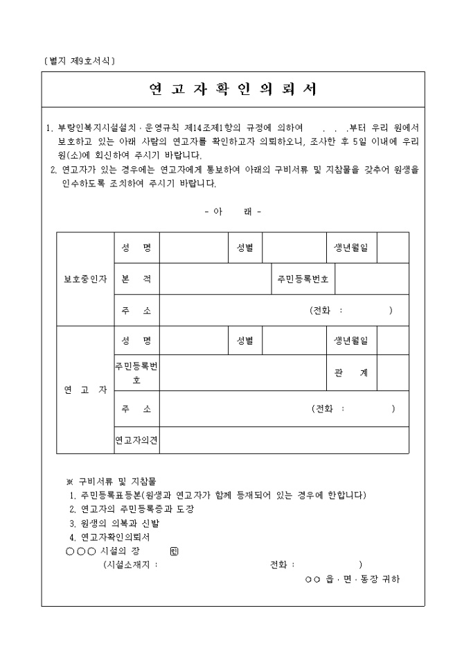 1. 부랑인복지시설설치·운영규칙 제14조제1항의 규정에 의거한 연고자 확인 의뢰서식입니다.