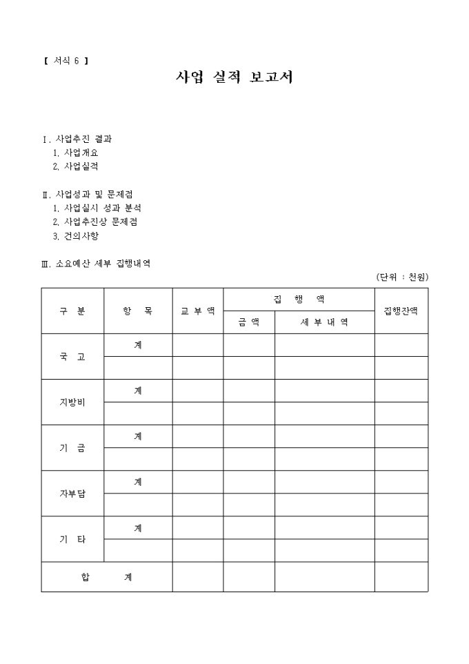 9,000원/월복권기금사업 집행서식중의 사업 실적 보고서 입니다. 사업추진 결과(사업개요, 사업실적), 사업성과 및 문제점(사업실시 성과 분석, 사업추진상 문제점, 건의사항), 소요예산 세부 집행내역 등의 항목이 있습니다.