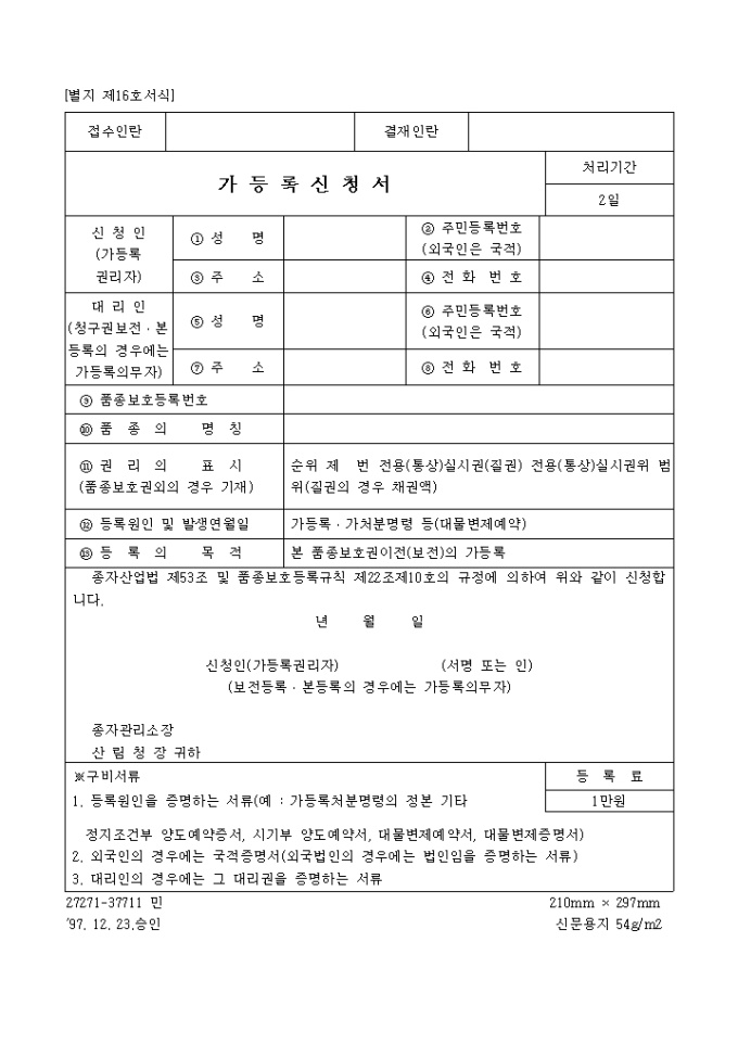 9,000원/월이 서식은 품종 보호에 대한 가등록 신청서로서 신청인 혹은 대리인의 인적사항과 품종보호등록번호, 품종의 명칭 등을 기입합니다.