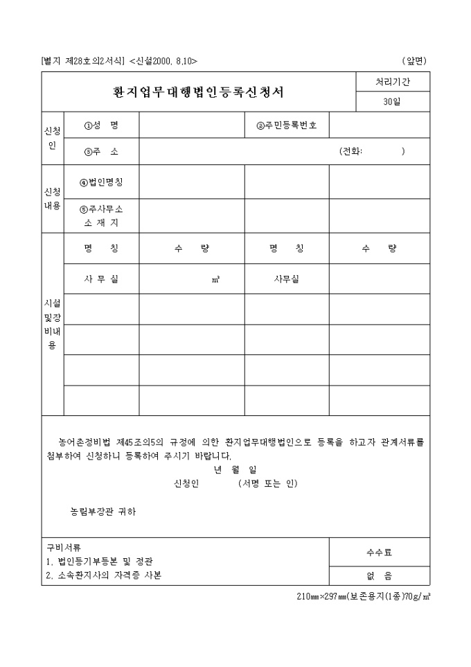 9,000원/월농어촌정비법 제45조의5의 규정에 의한 환지업무대행법인으로 등록을 하고자 하는 신청서입니다.