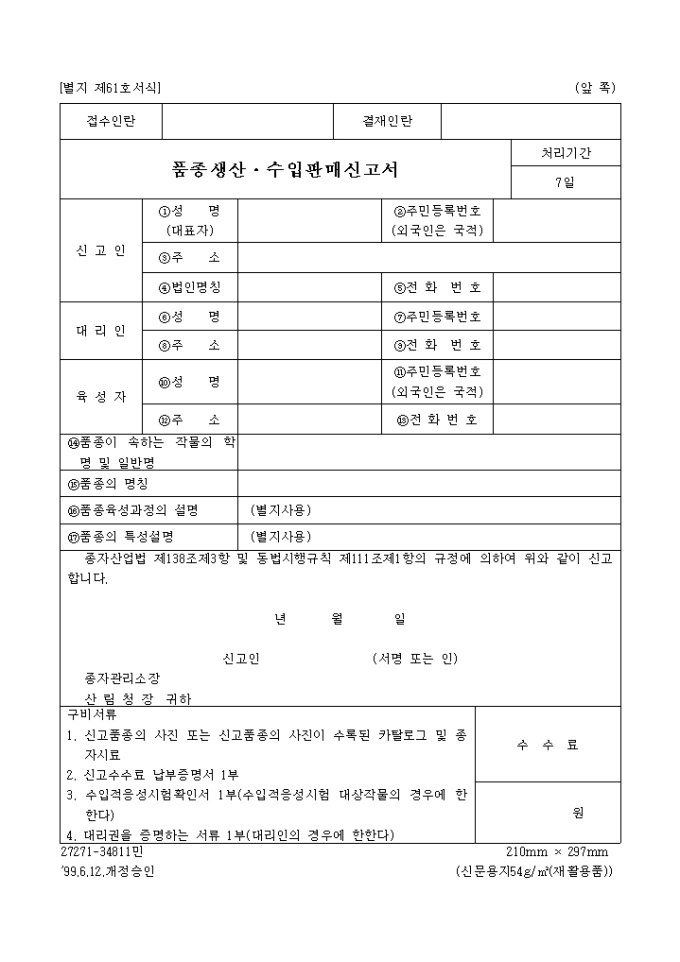 품종생산판매신고서(별지 제61호서식)