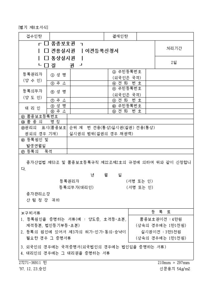 9,000원/월이 서식은 품종보호권의 이전등록 신청서로서 등록권리자와 등록의무자 혹은 대리인의 인적사항, 품종보호등록번호, 품종의 명칭 등을 기입합니다.
