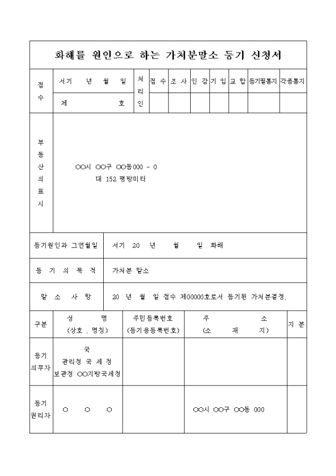 화해를 원인으로 하는 가처분말소 등기 신청서입니다.