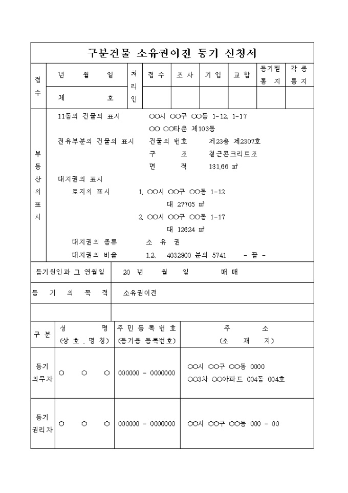 매매를 원인으로 하는 구분건물 소유권 이전등기 신청서입니다.