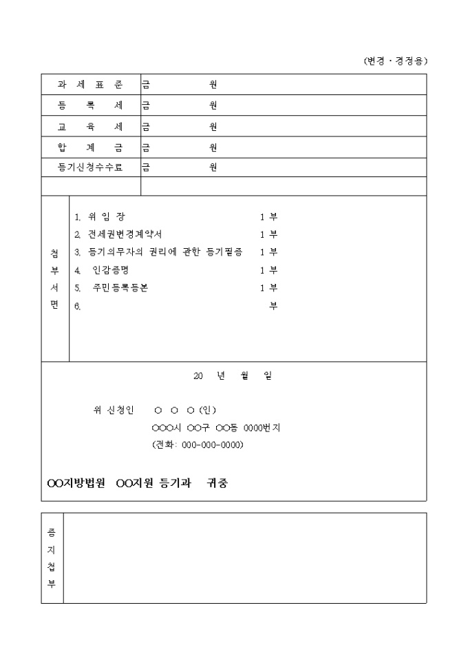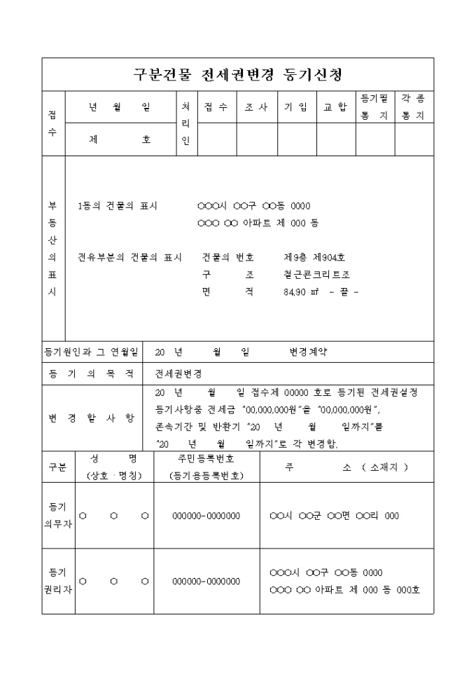 9,000원/월전세금의 증액과 기간연장을 내용으로 하는 구분건물 전세권변경 등기 신청서입니다.