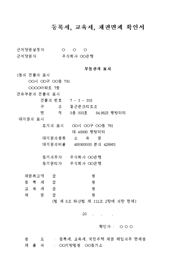 9,000원/월등록세, 교육세, 국민주택 채권 매입의무 면제를 확인하는 서면입니다.