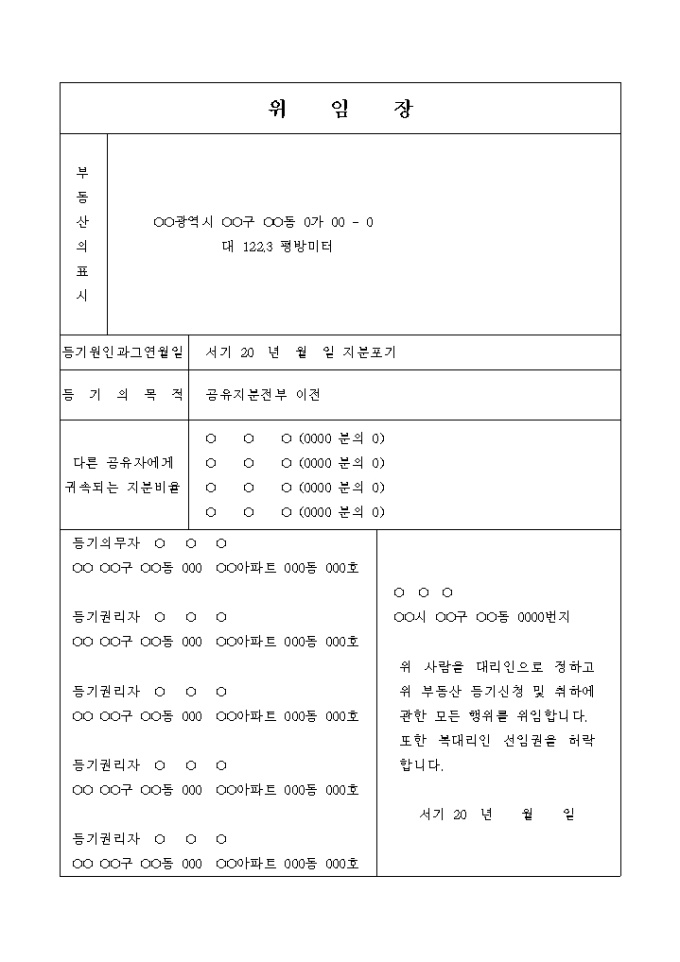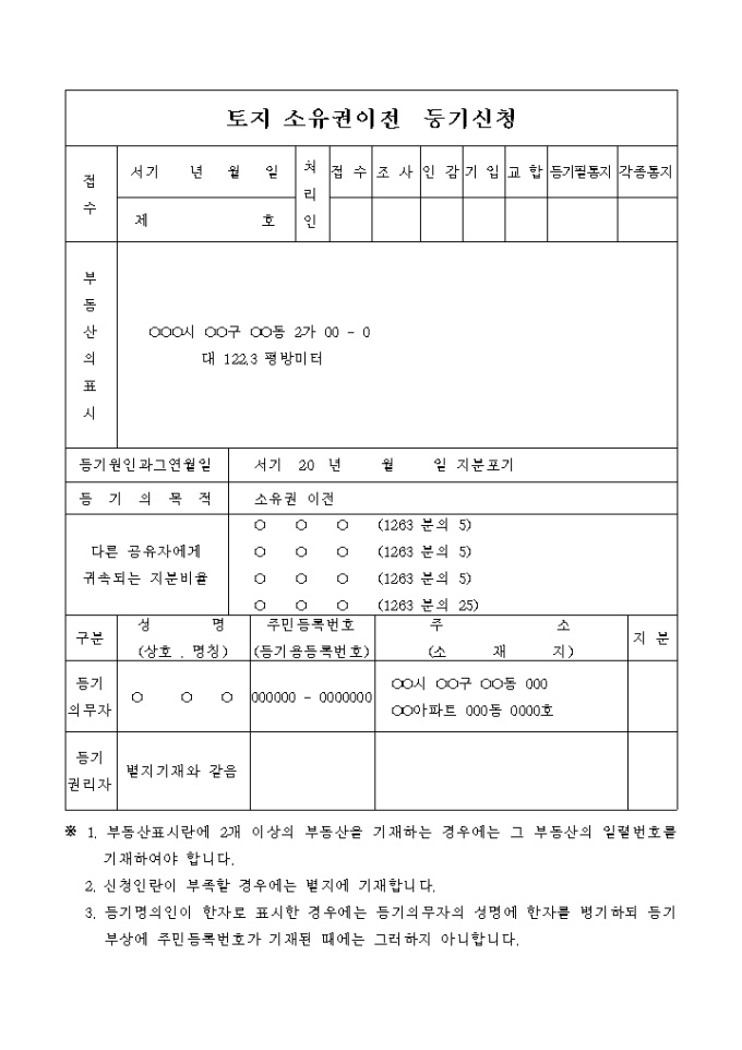 9,000원/월공유지분 전부의 포기를 원인으로 하는 소유권이전 등기 신청서입니다.