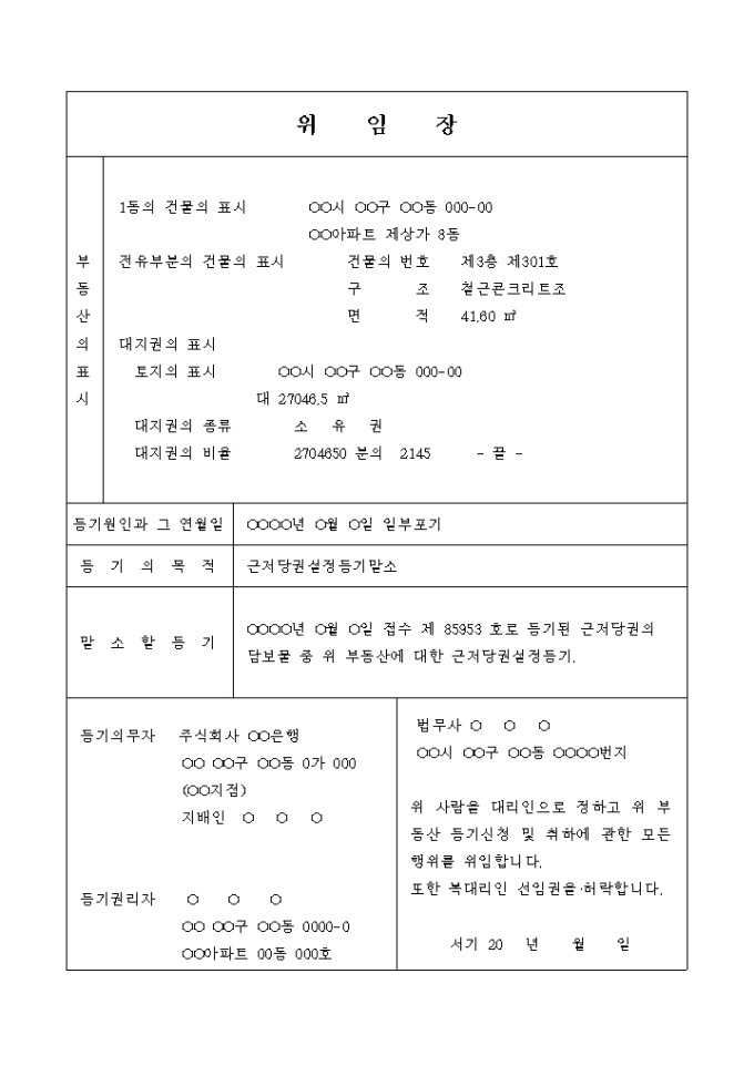 9,000원/월근저당권설정 등기 말소 신청에 관한 권한을 위임하는 위임장입니다.