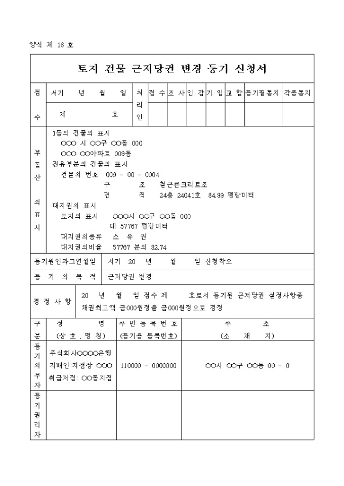 금액착오로 인한 토지 건물 근저당권 변경 등기 신청서입니다.