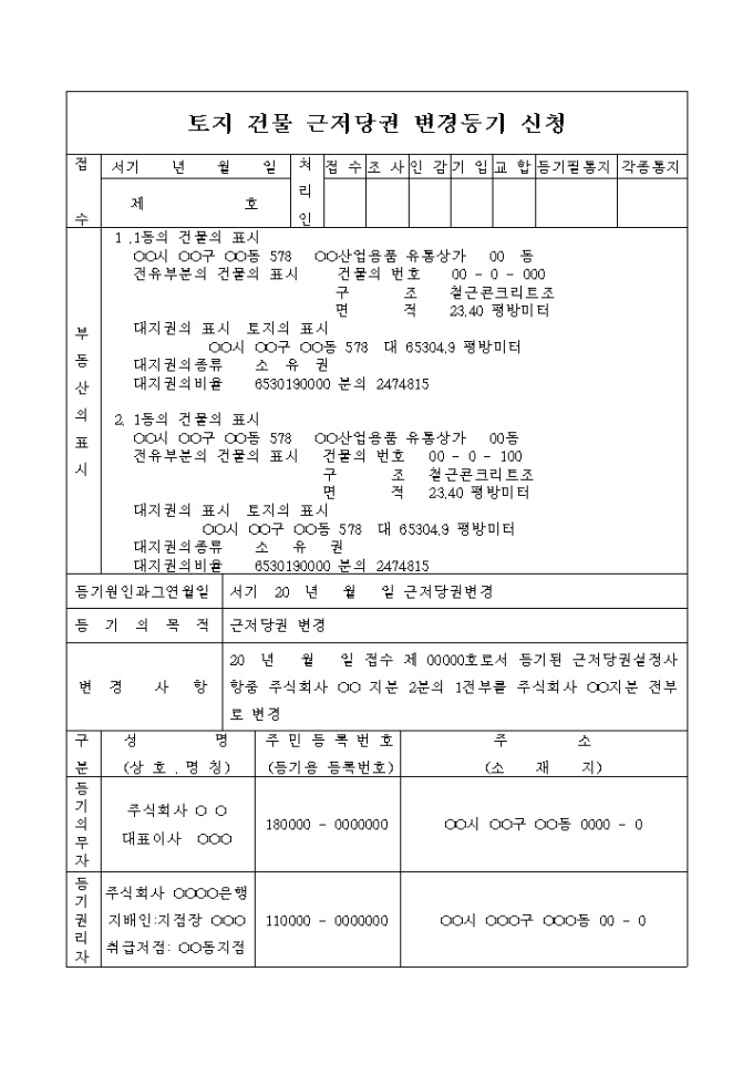 9,000원/월지분의 변경으로 인한 토지 건물 근저당권 변경등기 신청서입니다.