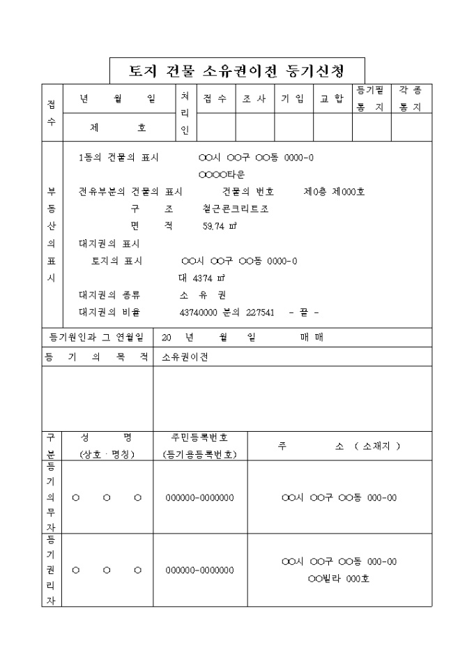 9,000원/월매매로 인한 토지 건물 소유권이전 등기 신청서입니다.