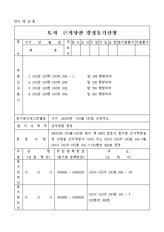 주소의 착오로 인한 토지 근저당권경정 등기 신청서입니다.