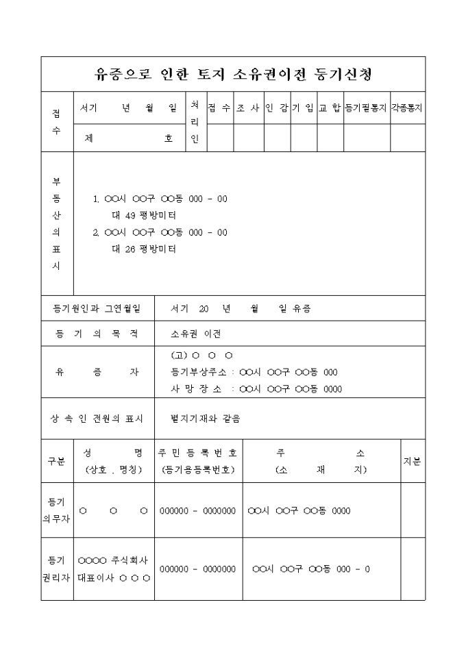 유증으로 인한 토지 소유권이전 등기 신청서입니다.