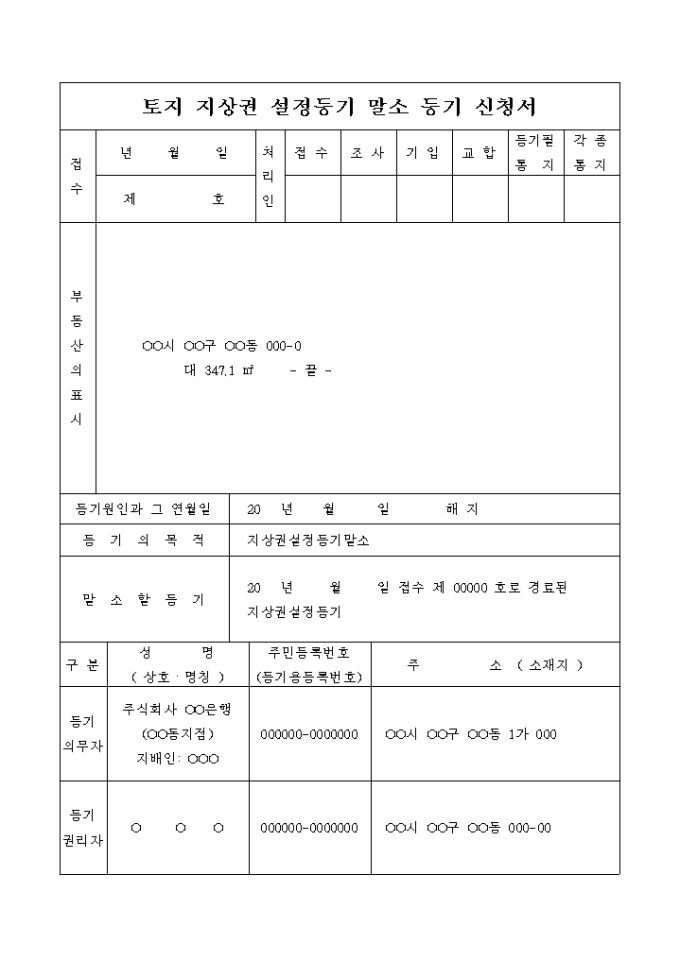 9,000원/월해지로 인한 토지 지상권 설정등기 말소 등기 신청서입니다.